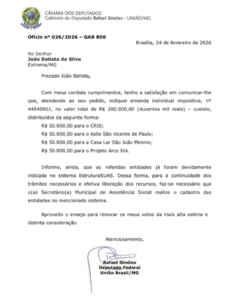 De acordo com o ofício que formaliza a indicação, as instituições já foram registradas no sistema EstruturaSUAS, plataforma utilizada para a gestão de recursos da assistência social. No entanto, para que o repasse seja efetivamente realizado, ainda é necessário que a Secretaria Municipal de Assistência Social conclua o cadastro das entidades no sistema, garantindo o andamento dos trâmites burocráticos exigidos.